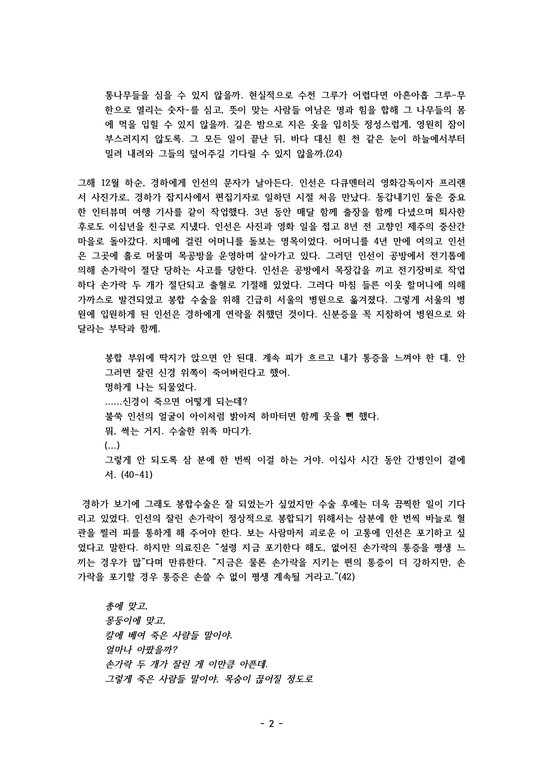 두 사람의 대화 속에서 경하는 자신의 꿈과 존재 의의를 되짚어 보며, 인선은 경하의 고민을 경청하며 그를 돕습니다. 그들의 관계는 단순한 우정을 넘어 서로의 삶을 이해하고 치유하는 과정을 그립니다. 이 소설은 그러한 관계를 통해 인간의 복잡한 감정을 사실적으로 묘사합니다.