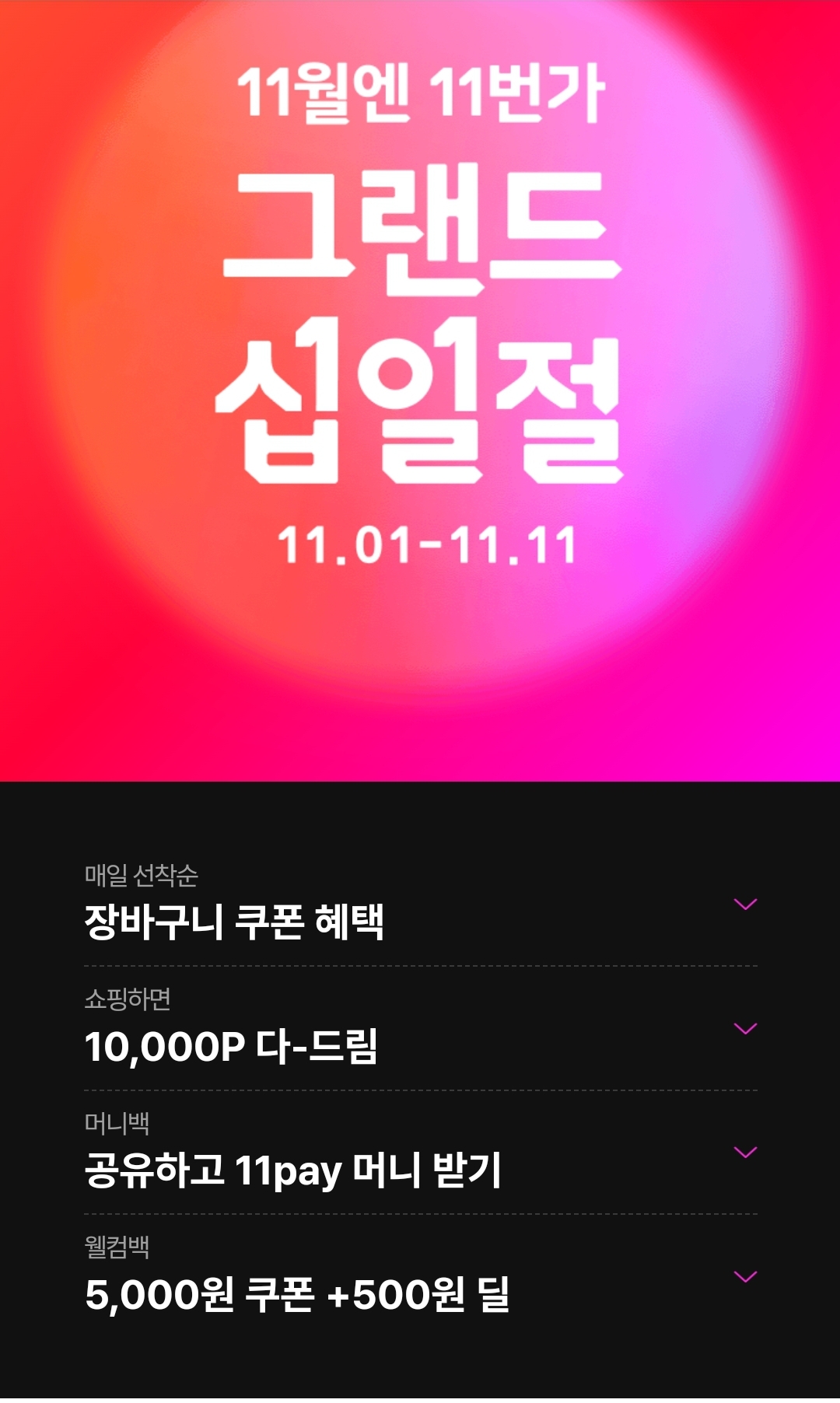 - 십일절 챌린지 : 참여하면 추가 혜택을 받을 수 있는 이벤트입니다. 다양한 미션을 수행하고, 성공적으로 완료하면 추가 쿠폰이나 포인트를 받을 수 있습니다.
