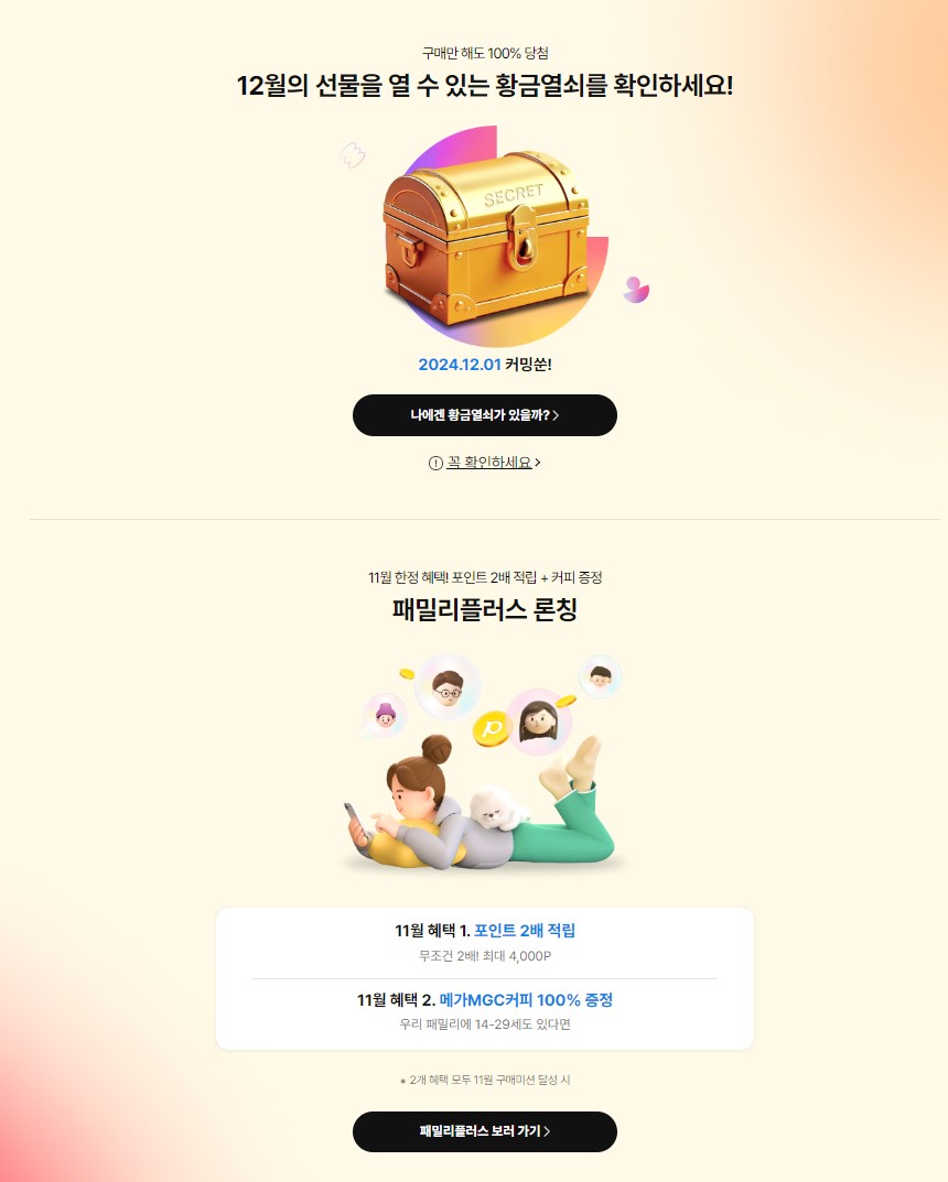 황금열쇠 이벤트와 포인트 2배 적립이 가능한 패밀리 플러스도 기대해주세요~
